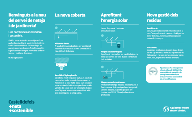 Contamos con un sistema de recogida de aguas pluviales de la cubierta de la nave de unos 7.300 m2, conduciendo todas las aguas a 2 depósitos de 40 m3; el agua recogida en los depósitos sirva por el servicio de limpieza de los camiones de SAC. El espacio para realizar este servicio de limpieza está ubicado en el patio interior de la nave. El agua almacenada en los depósitos pluviales de 80 m³ llenan otro depósito de 5 m³ por el proceso de tratamiento ubicado junto al lugar de limpieza que para garantizar las normativas de salud se trata con cloro, como si fuera una piscina. Esta agua ya se puede utilizar y se aprovecha por la limpieza de los vehículos y por el llenado de los depósitos de las barredoras que limpian las calles de Castelldefels.