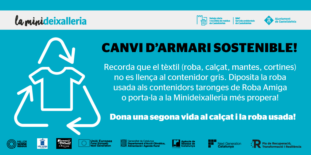 Segons dades de l'Agència de Residus de Catalunya, només se separa correctament un 10% per tant, el 90% dels residus tèxtils acaba a l'abocador oa la incineradora, cosa que comporta un impacte negatiu per al medi ambient . Castelldefels ja compta amb més de 30 contenidors taronges de recollida tèxtil de l'entitat social Roba Amiga, que es gestiona mitjançant la Fundació Formació i Treball, que té com a missió facilitar l'accés al mercat laboral persones en risc dexclusió social. A partir d'ara, es podrà portar també la roba en desús a les Minipuntes netes.